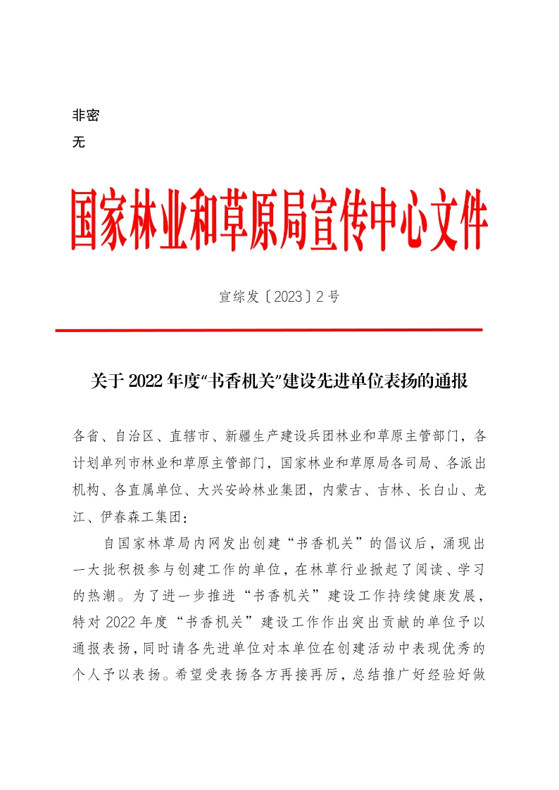 近日,国家林业和草原局宣传中心通报表扬2022年度“书香机关”建设先进单位,吉林森工集团榜上有名。