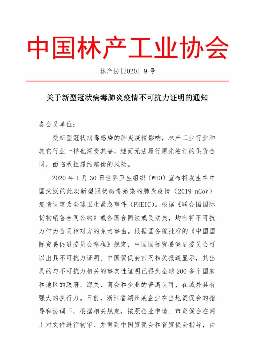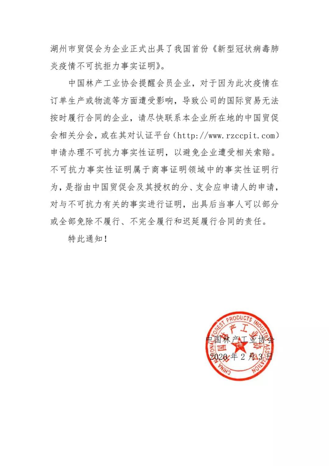 中国林产工业协会日前发布《关于新型冠状病毒肺炎疫情不可抗力证明的通知》,提醒会员企业对于因此次疫情在订单生产或物流等方面遭受影响,导致公司的国际贸易无法按时履行合同的企业,尽快联系本企业所在地的中国贸促会相关分会,或在其认证平台(http://www.rzccpit.com)申请办理不可抗力事实性证明,以避免企业遭受相关索赔。