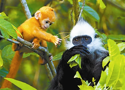 三、中国黄(渤)海候鸟栖息地(第一期)申遗成功 6月30日至7月10日,联合国教科文组织(UNESCO)第43届世界遗产委员会会议在阿塞拜疆首都巴库举行。中国黄(渤)海候鸟栖息地(第一期)申遗项目通过大会审议,成为我国第14项世界自然遗产。至此,我国世界遗产总数达到55项,与意大利并列世界第一。中国黄(渤)海候鸟栖息地(第一期)申遗成功,进一步巩固了我国世界自然遗产全球第一的地位,使我国自然遗产(含双遗产)占全球同类遗产数量的7%。我国在自然遗产领域取得的巨大成功,体现了大国担当,反映了国际社会对中国自然遗产工作的广泛认同,为全球人口稠密、经济高速发展地区开展自然保护提供了全新的中国经验。  “秘境之眼”精彩瞬间——广西崇左白头叶猴国家级自然保护区内,白头叶猴食用树叶。