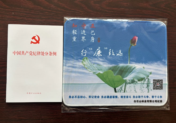 为进一步提高党员干部的规矩意识和行为规范,营造廉洁文化氛围,近日,白石山林业公司纪委为全体中层干部发放了《中国共产党纪律处分条例》及“廉洁主题”鼠标垫,用桌面“小文化”做好廉洁“大文章”。