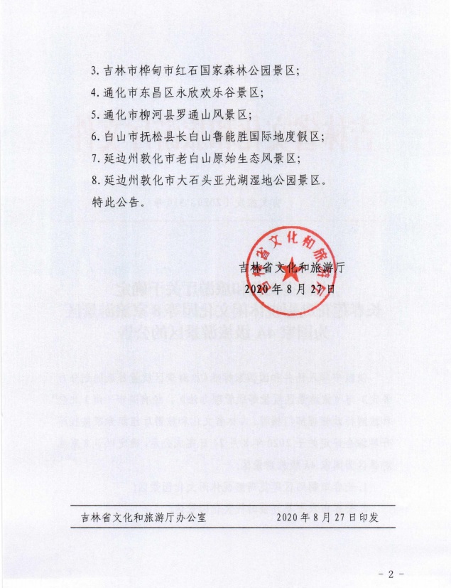 8月27日,吉林省文化和旅游厅发布公告,批准吉林红石国家森林公园在内的8家景区成为国家AAAA级旅游景区。此次晋升评定工作由吉林省文化和旅游厅组织实施,根据中华人民共和国《旅游景区质量等级的划分与评定》和《旅游景区质量等级管理办法》,经有关市(州)文化和旅游行政部门推荐,由专家组从材料初评到实地检查,历时近4个月。
