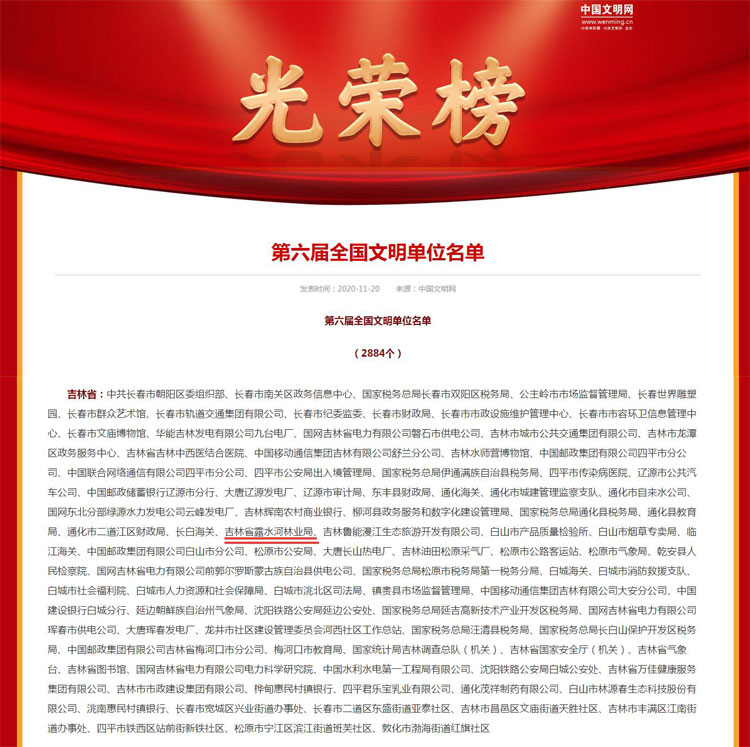 | 11月20日,中央文明委在北京召开全国精神文明建设工作表彰大会,命名表彰了第六届全国文明城市、文明村镇、文明单位和第二届全国文明家庭、文明校园及新一届全国未成年人思想道德建设工作先进,露水河林业局荣获单位最高荣誉"全国文明单位"称号。  长期以来,露水河林业局高度重视精神文明建设工作,始终把保持和提升文明单位的创建水平作为企业中心工作、龙头工作,深度践行绿水青山就是金山银山的发展理念,以培育和践行社会主义核心价值观为核心,以创建文明单位为抓手,扎实推进精神文明建设工作,树立了企业不断开拓进取的良好形象,促进了社会事业的较快发展,有效推动了国有林区改革和转型发展,实现了生态效益、社会效益和经济效益的同步增长,在社会主义精神文明建设中取得了显著成绩。