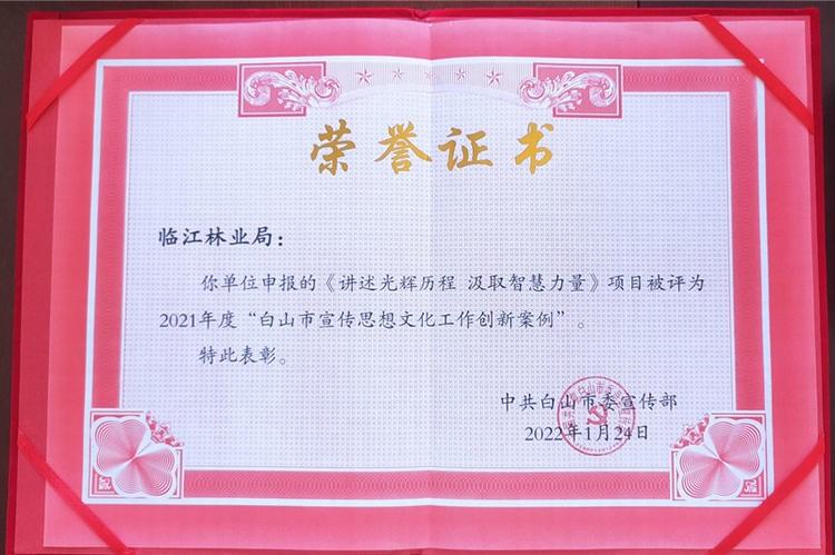 日前,临江林业局申报的《讲述光辉历程 汲取智慧力量》项目被评为2021年度“白山市宣传思想文化工作创新案例”。