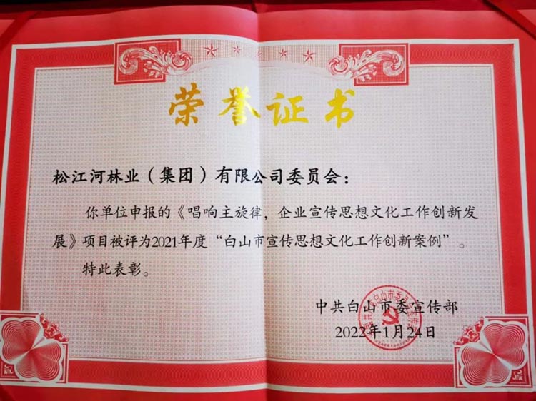 经中共白山市委宣传部评选,松江河林业(集团)有限公司申报的《唱响主旋律,企业宣传思想文化工作创新发展》项目,再次被评为“白山市宣传思想文化工作创新案例”。公司已是连续第三年获得此荣誉。