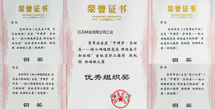 公司高度重视本次大赛,组织各基层单位干部职工积极投稿,踊跃参与。经组委会层层评选,红石林业公司工会获“优秀组织奖”。公司4名职工拍摄的微视频作品《凝心铸魂跟党走 团结奋进新征程》《欢庆五十载 书写新辉煌》《小浆果大产业》《点亮“匠心之梦”》多角度、多维度地展现了红林公司广大干部职工在党的正确指引下,理想信念坚定不移、文化生活丰富多彩、新兴产业蓬勃发展、行业工匠勤勉敬业,以红林职工的真实生活和工作剪影,诠释了“中国梦·劳动美——凝心铸魂跟党走团结奋斗新征程”活动主题,喜获铜奖。