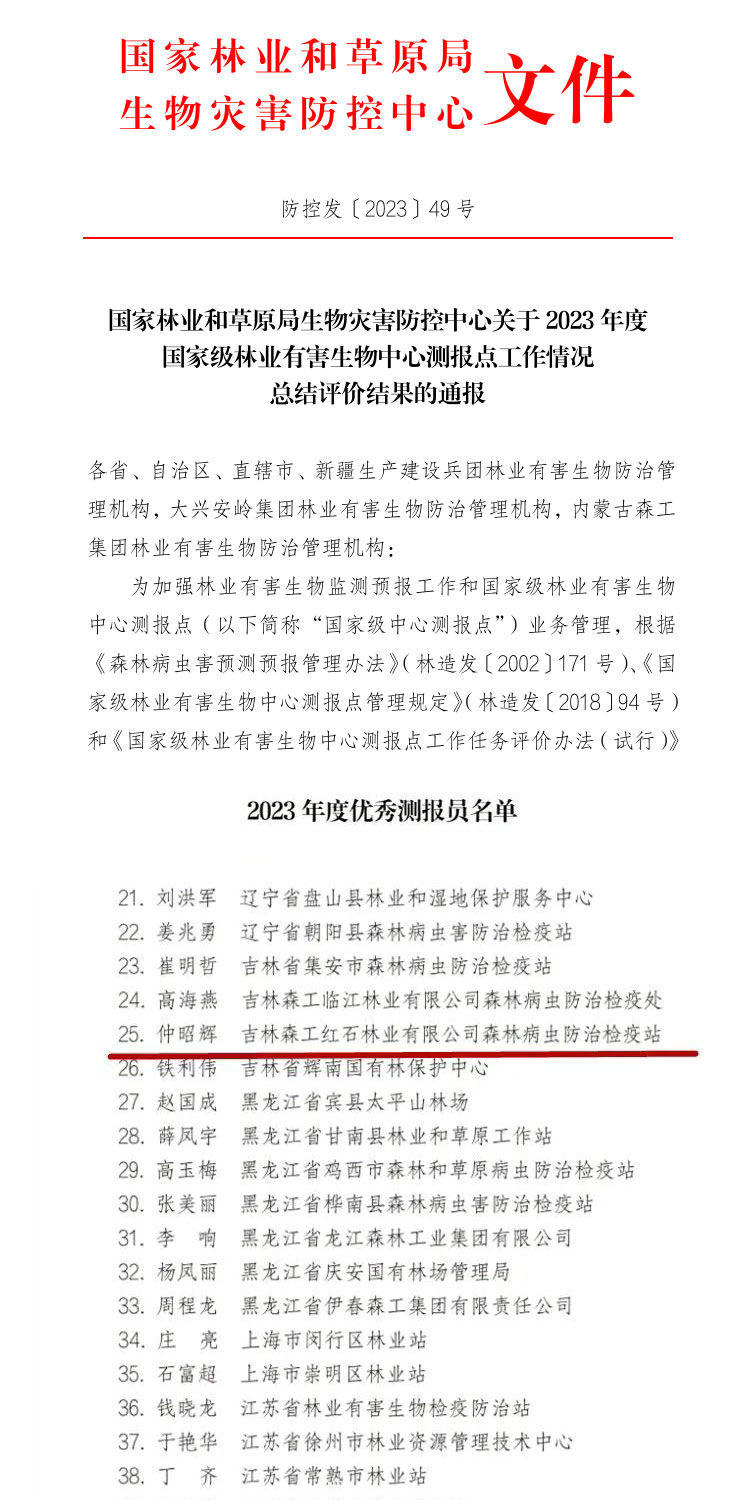 日前,国家林业和草原局生物灾害防控中心发布《2023年度国家级林业有害生物中心测报点工作情况总结评价结果的通报》,红石林业公司森林病虫防治检疫站职工仲昭辉喜获2023年度“优秀测报员”荣誉称号。 仲昭辉,男,汉族,35周岁,毕业于天津武警指挥学院法律专业,本科学历,中共党员,现任森防检疫站测报科科长,负责林业有害生物预测、预报管理工作。 多年来,仲昭辉始终保持恪尽职守、勤奋质朴、科学严谨的工作态度,认真组织开展林业有害生物普查、监测和分析,及时发布监测动态、趋势预报和除治成效监测分析,科学组织开展“人防”“物防”和“技防”。 他在各级刊物上发表了多篇学术论文,全程参与了吉林省科技厅《吉林省东部山区云杉八齿小蠹信息素监测技术研究》项目,出色完成所有课题内容,其成果填补了吉林省在该领域的空白,为吉林省制订地方标准提供了准确的科学依据。《人民日报》、中国新闻网、国家林草局网站都对仲昭辉进行了专访报道。 红石林业公司广大干部职工纷纷表示,将以仲昭辉为榜样,在平凡的林业工作岗位上努力学习先进、争当先进,为加强森林资源保护、保障森林生态安全和林业企业改革发展作出积极贡献。