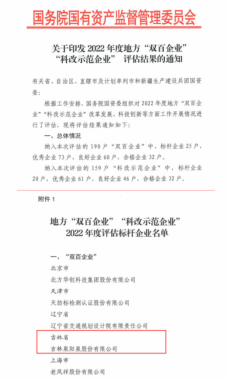 近日,国务院国资委印发《关于2022年度地方“双百企业”“科改示范企业”评估结果的通知》,我省的吉林泉阳泉股份有限公司榜上有名,成为“双百企业”标杆等级。