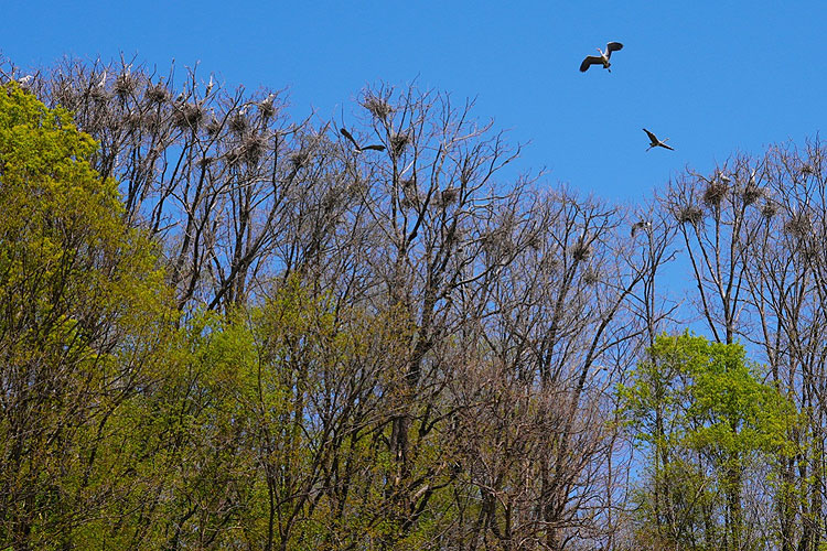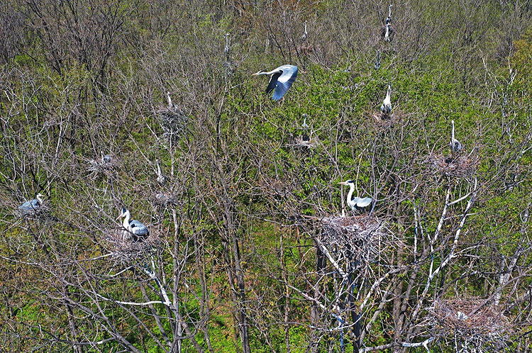在林场施业区内,近两百只苍鹭在密林间筑起鸟巢,它们或在树梢停留,或寻觅食物,不时有苍鹭盘旋在天空,守护鸟巢安全。“大约五六年前,几只苍鹭开始在这里安家,此后每年开春它们都会按时回来,有的修葺老巢、有的再筑新窝,然后开始繁衍后代。等到七八月份,小鸟长大了,鸟群又会在入秋后陆续迁徙到南方过冬。”林场森林管护队队长田勇说。
