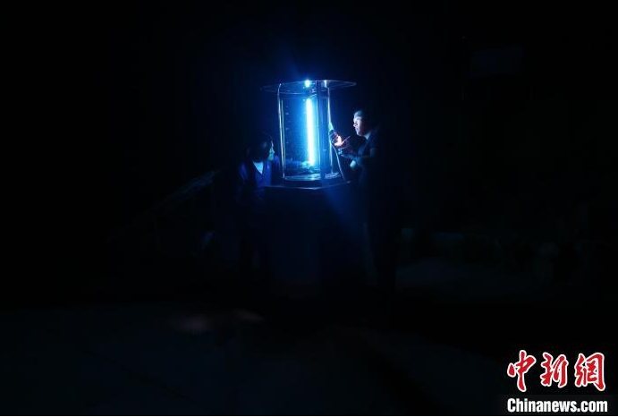 仲昭辉(右一)和同事打开灯诱装置
