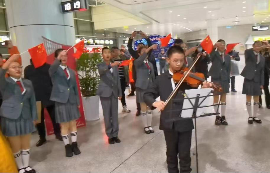 17时20分,当阿勒泰“小葡萄”研学团队举着小国旗,在机场工作人员的引导下有序走进龙嘉成机场大厅时,早已等候接机的“小冻梨”们用一首《我和我的祖国》欢迎他们的到来。满眼好奇的“小葡萄”们一下飞机就受到了长春的热情。