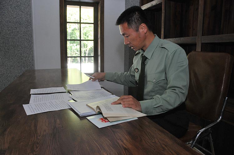 为了还原历史场景,需要寻找大量的历史文献,他去桦甸市档案馆查阅《桦甸县志》、《桦甸历史》,往返几十次。起初,他没少碰钉子,渐渐地,工作人员被他的执着感动,帮助他查阅资料,并提供一位还健在的老抗联战士的联络方式。得到这个消息,他欣喜若狂,连夜去拜访老战士,在和老战士的交谈中,当年密营的布局在他的大脑中清晰起来。如今密营遗址里的将军泉、碾盘、司令部遗址……原址原貌地展现在世人面前,都是那位老战士提供的。 为了寻找到更多的资料,他开始四处购买有关于东北抗联战争的书籍,各大书店、旧书摊,只要有关于这段历史的书籍,他都尽收囊中。 景区对外营业后,配备了接受过专业培训的讲解员,而那时的他仅仅是一名普通的工人,每当讲解员为游客讲解时,他就站在旁边偷偷地听,把讲解词记在小本子上,晚上回家再仔细琢磨。