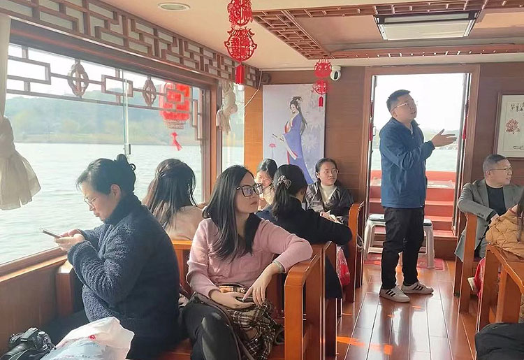 参加活动的女职工共同漫步游园,在湖边乘坐游船欣赏湖面美景,和煦的春风迎面吹来,船上欢声笑语不断。