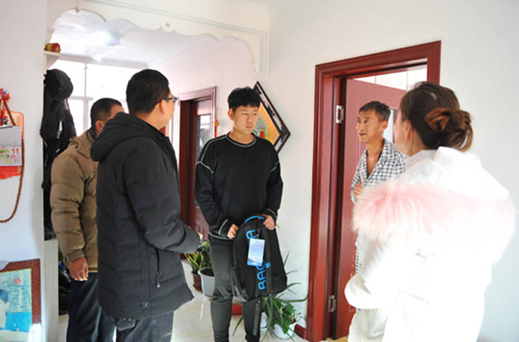 在家中,大家亲切地与周旭及其父母交谈,询问周旭的学习情况及生活中存在的困难,将书包、学习用品及慰问金送到周旭手中,叮嘱他要安心学习,勇敢面对困难,大家都是他的坚强后盾。