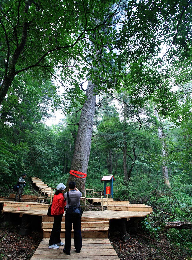 在古老的长白山原始森林中,有着一个天然优质矿泉水源地,此水源地为地下涌泉,水温常年8度。依山水而生的泉阳林业局就坐落于泉眼西北。古时将山南水北称之为阳,泉阳因此得名。在泉阳林业局抚安林场境内,有一个原始森林顶级群落,此群落位于东经127°45′44″,北纬42°21′30″,海拔980米左右。因该群落红松等古木生长茂盛,蔽日遮天,常有人迷失其中,故当地人称之为“林子不开”。这里的红松平均树龄在300年左右,最粗壮的一棵,树龄为509年,树高25米,冠幅15米,胸径121厘米。说到它,老人们可是赞不绝口,他们将此树称之为“将军松”。之所以这样称呼它,是源于古今两代将军的英雄传说。 据史料记载,明万历年间,日本大封建主丰田秀吉发动了侵朝战争,妄图以朝鲜为跳板,征服中国和印度。由于当时朝鲜国王李忪腐败无能,日本侵略军长驱直入,攻掠了朝鲜许多要地。十二月,明朝廷委任大将李如松为东征提督,率部东进开始了旷日持久的抗倭援朝战争。就在抗倭战争胜利前夕,大将军李如松同日军主力在朱舍里地(今抚松县)境内遭遇。李如松率部在中朝边境地带、长白山密林中与倭寇激战,不幸中敌奸计,受了重伤。临终前,他将其弟李如海叫到身旁,交代了抗倭遗愿,后不治身亡。明帝令人将其遗体运往京城厚葬。为纪念其兄东征壮举,李如海及部下将李如松衣冠葬在密林之中一棵红松前。转日,其弟李如海率部同倭寇激战,危急时刻,只见李如松墓前闪出一道白光,将敌军阻在千米之外。李如海趁机率兵冲上前沿,大败倭寇。战事过后,李如海回墓前叩拜,发现墓后这棵红松愈加挺拔粗壮,枝叶繁茂,茂密的枝叶遮蔽着周边树木,形成庇护,许多百姓听此消息后都纷纷前来拜谒,凭吊将军民族情怀,期望得到神树庇护。并将此树称之为“将军松”。 事情过去了五百余年,这里的百姓依然没有遗忘此事。一九三一年“九·一八”事变后,日本帝国主义全面占领东北地区,沿途不仅残害百姓,还对东北富庶的自然资源进行大肆掠夺。东北抗日民众不甘其辱,纷纷起来反抗,组织了大批抗日武装回击日寇暴行。当时在抚松一带的大小于海二人,就带领了一支队伍驻扎于现今东北岔林场施业区内的一座深山里。他们联合附近的猎户、木把和采药的山民,利用山高林密和地利之便,机智灵活地与日寇战斗,成了这一带远近闻名的抗日武装。 为收编这支抗日武装,1935年,东北联军第一集团军司令员杨靖宇将军,特派南满一军直属游击总队总队长苏剑飞(后为江北共同指挥机关总指挥)到这一带开展收编。在中国共产党抗日救国思想的感召下,于海兄弟欣然同意加入抗联,并帮助苏剑飞在“林子不开”的“将军松”所在地建立密营。这里山高坡陡,山脚下还有一条常年流淌的溪河,易守难攻。苏剑飞同于海兄弟形成犄角之势,互相支援,形成稳固的抗日根据地。因这里林密人稀,后勤补给十分困难,抗日将士“天当被,地当床,山菜野果当干粮”,生活十分艰苦。在“林子不开”,日军为大肆掠夺红松等优质木材,修建了一条铁路,以便就近伐盗木材,并从此线运往鸭绿江等河流,转而运往日本国内。苏剑飞在此驻扎后,深恶日军暴行,随后制定了抵御计划,同日本侵略者展开了激烈的抗争。一天傍晚,日军又开始大举出动盗伐木材,苏剑飞接到情报立即率部抗击,带领小分队炸毁一段邻近的铁轨,迫使运输中断。日本侵略军恼羞成怒,大举进山搜索,妄图剿灭心腹之患。为了不暴露密营地点,苏剑飞只能带领小分队退回“林子不开”。虽然敌军尾随而至,但苏剑飞等将士分散隐蔽在“将军松”附近,由于树高林密,又有“将军松”庇护,最终敌人搜索无果,悻悻离去。1935年4月,苏剑飞带领部队攻打万良据点。由于情报失误,日本鬼子突然增兵,苏剑飞所部抗日武装损失惨重,只好被迫转移。鬼子山林讨伐队紧追不舍,为了不暴露“林子不开”密营,他把鬼子引向相反方向,在“高四爷”小山(今胜利林场施业区内)一带,被日本鬼子山林讨伐队包围。苏剑飞见突围无忘,决定与敌誓死抗争。命令全体将士全力战斗,同日本鬼子作最后一搏,即便战至一人,也要重创敌寇。最后,由于寡不敌众,所部将士全部遇难。苏剑飞将军亦拼尽最后一息壮烈牺牲,年仅29岁。 得知苏将军遇难后,于海兄弟悲痛欲绝。为给抗联将士复仇,他们赶到“高四爷”小山一带,利用地利优势,与敌迂回作战,将鬼子山林讨伐队打得落花流水,逃回万良据点。于海兄弟将苏剑飞将军掩埋在“高四爷”小山山脚下。解放后,地方政府为纪念苏剑飞等抗日英雄,在北岗镇201国道旁,建立了苏剑飞墓地。每年清明节,民众自发到这里为抗日英雄扫墓,这里也成为爱国主义教育基地。 苏剑飞牺牲后,于海兄弟回到“林子不开”,以此为根据地,顽强抗击偷盗林木的日本侵略军。因为于海兄弟对“林子不开”一带非常熟悉,又有“将军松”庇护,只要日本侵略军在盗伐运输,于海兄弟就立即采用游击战术进行阻击,打得日本鬼子无法立足,掠夺的大批木材亦堆放在山里无法运走,很好地保护了长白山林区宝贵的森林资源。  饱经风霜的“将军松”依然受世人敬仰