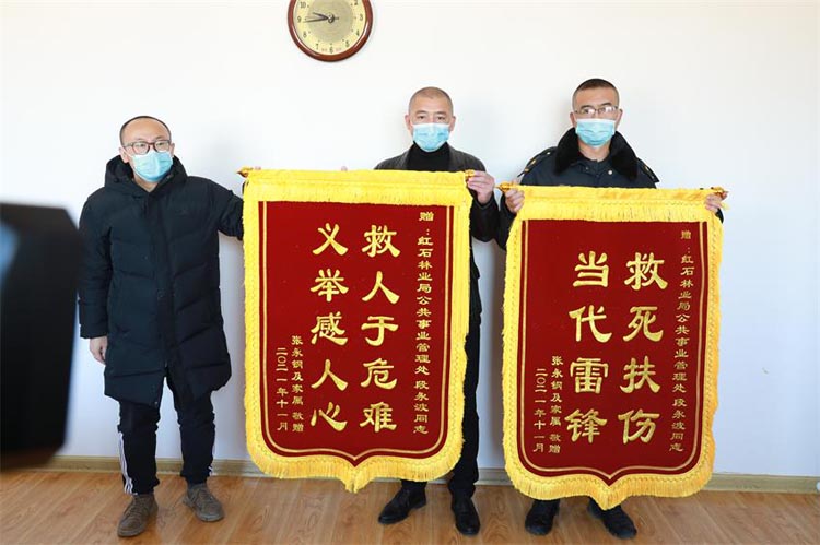 “感谢段永波,是他的及时救助,为我老父亲赢得了宝贵的抢救时间……”11月15日一大早,吉林市市民张先生风尘仆仆地赶到红石林业局,眼含热泪向公共事业管理处领导和段永波表达感谢之情,并亲手送上了“救人于危难 义举感人心”和“救死扶伤 当代雷锋”两面锦旗。