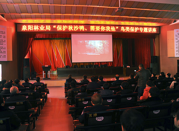 为打造人与自然和谐共生的生态文明新泉林,党的十八大以来,泉阳林业局全面加强生态建设,强化生态保护,成立泉阳湖水上管护站和野生动植物保护站,辖区生态环境不断优化,吸引了以中华秋沙鸭为代表的众多珍稀水鸟落户泉阳湖,在这个“水鸟天堂”聚居悠游,繁衍生息。 为进一步强化生态环保理念,1月11日,世界自然基金会(WWF)东北办公室主任、中华秋沙鸭保护专家刘培琦,受泉阳林业局之邀,为干部员工代表举办了一堂“保护秋沙鸭、需要你我他”鸟类保护专题讲座。