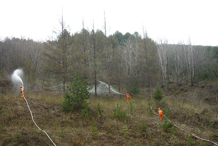 水泵架设、管带连接和收存演示结束后,所有参加演练的扑火队开展了水泵架设、管带连接的平地和山坡地两种不同地形的实战演练。演练中,临江林业局参加演练的两支扑火队训练有素,动作麻利,从水泵架设、管带连接到水枪喷水,各扑火队员分工明确、配合默契。武警白山市森林支队靠前驻防指挥官对现场演练中的相关技术、战术进行了现场指导。