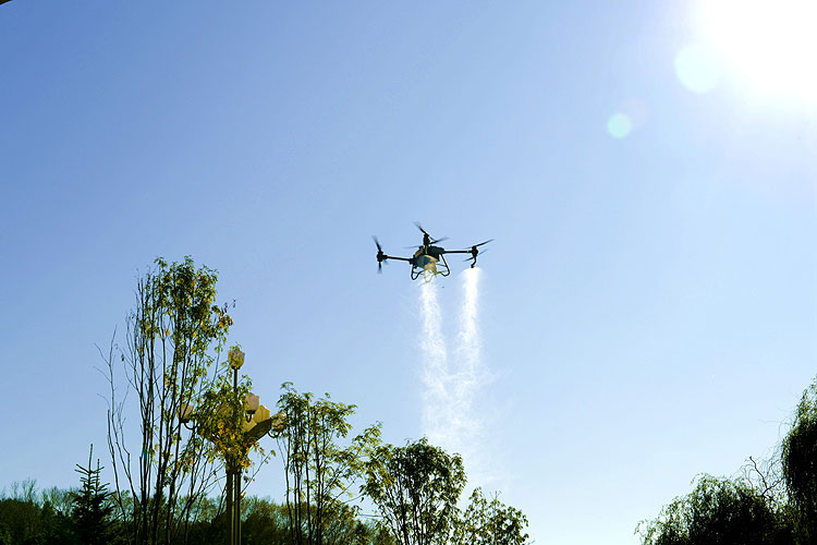 9月20日,白石山林业公司森林病虫害防治检疫站和种质资源库联合开展病虫害防治工作,使用大疆T40植保无人机对办公区域的百花花楸、黄檗等树木喷洒农药,此举有效地解决了高大树木和大面积生态林木人工喷洒难的问题,喷洒区域更广,药物分布更加均匀,以前需要1个小时才能完成的工作量,现在只要10分钟,极大提高了工作效率。