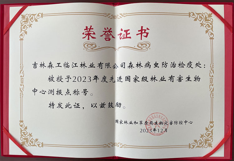 临江林业公司森林病虫防治检疫处获评“2023年度先进国家级林业有害生物中心测报点”