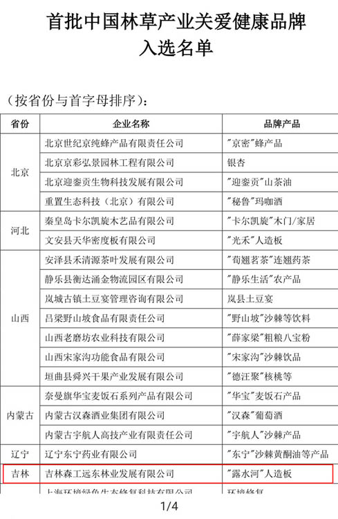 2020年6月19日,中国林业产业联合会发布了“首批中国林草产业关爱健康品牌”评审结果,吉林森工远东林业发展有限公司推荐的“露水河”牌人造板,经过了组委会的评审认定,成为首批中国林草产业关爱健康品牌。