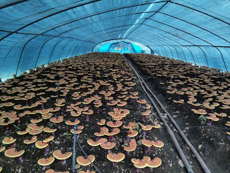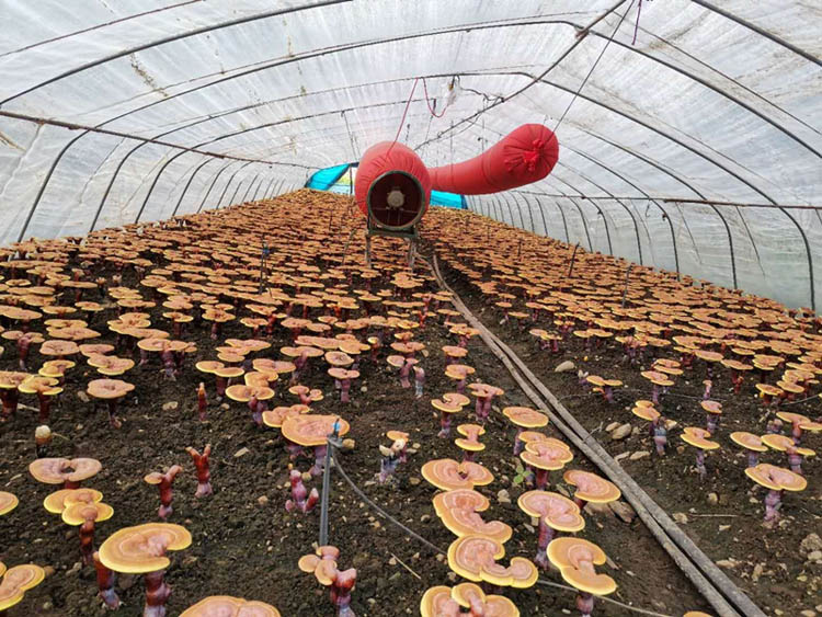 伴随着鼓风机的呼呼声,林场工作人员分批次对成熟的灵芝孢子粉进行收集。收获的孢子粉再经过后续烘干、消毒、破壁、冷藏、包装等工序后即可通过实体店铺和网络线上进行销售。收获孢子粉完毕的灵芝子实体可直接切片或研粉销售。