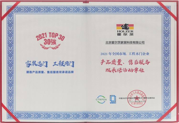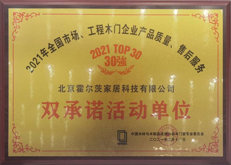 2021年3月18日,在全国木门双承诺品牌影响力大会暨中国木门窗行业年会上,凭借对产品的精益求精、服务标准的强有力执行与贯彻、生态环保理念的深入发展等优势,北京霍尔茨家居科技有限公司再次荣获“2021年全国市场、工程木门企业产品质量、售后服务双承诺活动单位”荣誉称号。