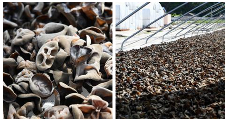 今年种植工艺参数控制严格,日常管理到位,又抓住了第一遍采收和晾晒的有利时机,“头茬”黑木耳乌黑光润,纹理清晰,朵形整齐,嗅之清香,质量上乘,产量喜人。 |