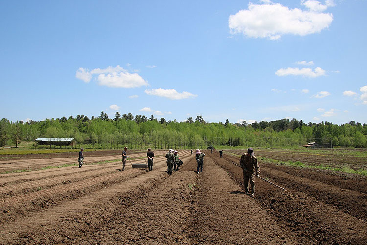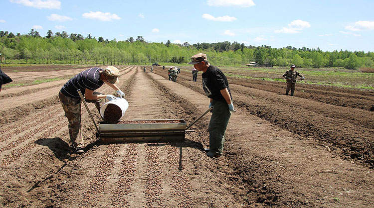 露水河林业公司国家林木良种基地甄选优质红松种子6015公斤进行沙藏。随着气温回暖,经过翻晒、过筛、装袋后,开始播种。基地积极抢抓有利时机,避开雷雨大风天气,清晨5点开始,从业人员将种子倒入专业播种器械中,采用半机械化播种方式,娴熟地把红松种子撒到修整好的土床上。整个播种过程严格按照操作流程进行,从消毒、人工找平、播种、镇压、到覆土等各项工序,技术人员把好质量关,经检查,每平方米播种粒数800粒左右,达到规程的标准。