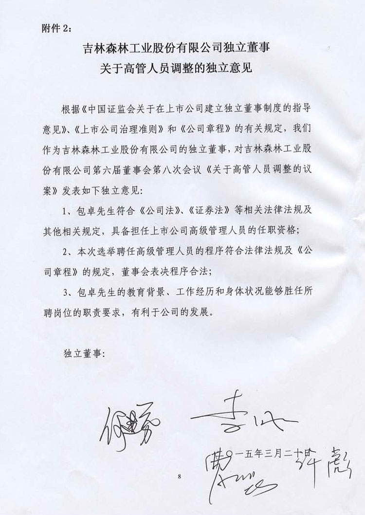 吉林森工独立董事关于高管人员调整的独立意见