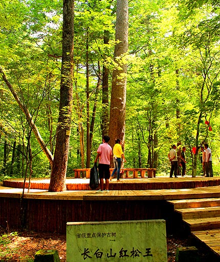 “长白山红松王”1996年3月29日被吉林省人民政府命名为省级重点保护古树。“长白山红松王”树龄500余年,树高35.5米,树冠呈伞形,胸径1.24米,三人才能合抱,材积15.39米,每当人们走过这里,都会怀着崇敬心情去“拜会”它。