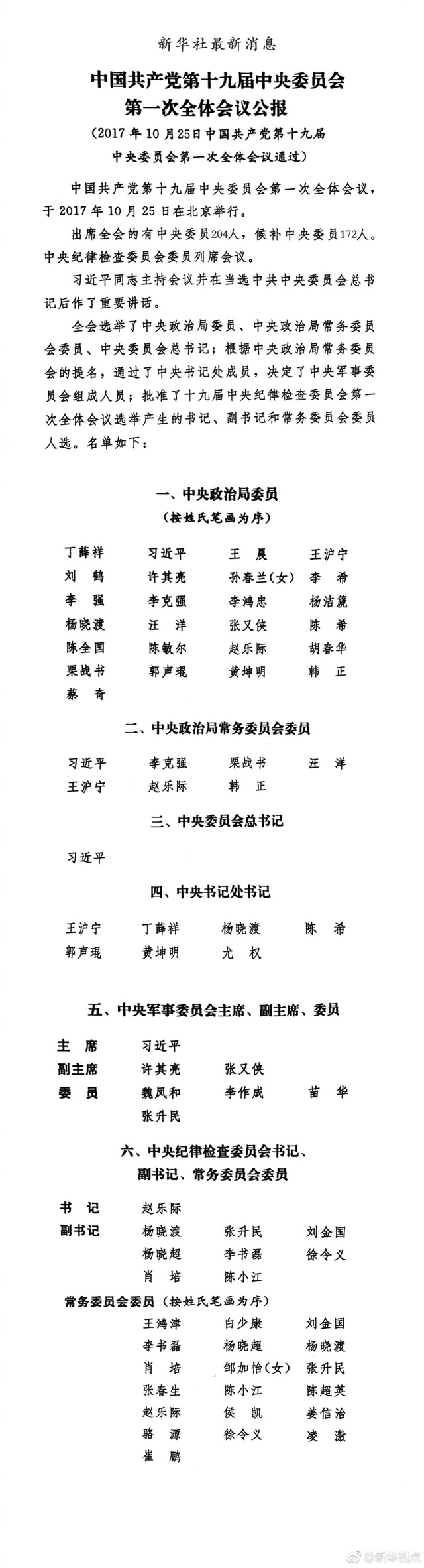 习近平等7人当选新一届中央政治局常委