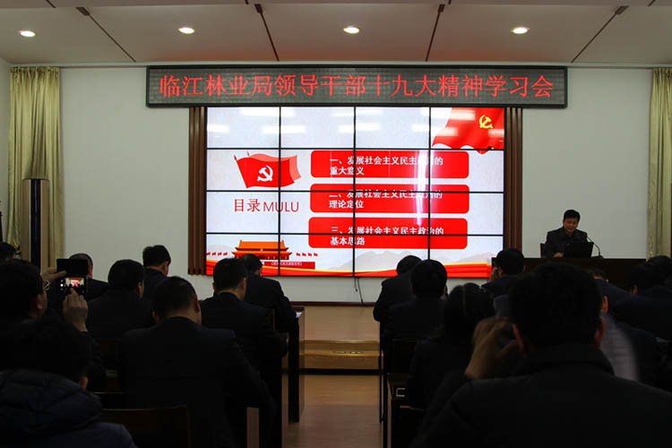 为深入宣传贯彻党的十九大精神,学懂弄通悟透新时代中国特色社会主义思想内涵,1月12日,临江林业局领导干部十九大精神学习会在机关五楼会议室召开。临江林业局党委副书记、纪委书记范作义主持会议。临江林业局机关副处级以上领导干部,临江林业局所属各单位书记、副书记、政工干事,一同聆听了白山市委党校教授周洪伟以《健全人民当家作主制度体系发展社会主义民主政治》为主题的十九大报告精神宣讲。