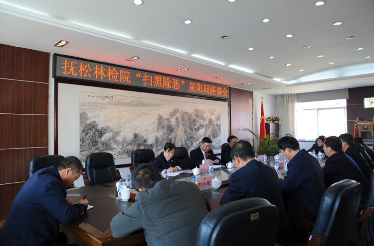 为充分发挥检察职能、落实检察责任,推进扫黑除恶专项斗争深入开展,4月3日,抚松林区检察院检察长李树庆一行深入泉阳林业局开展扫黑除恶专项斗争工作座谈会。局党政领导胡建荣、吴兴国、孙永福、刘利顺及相关部门、单位负责人参加会议。