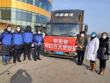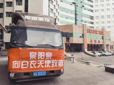 此前,泉阳泉紧急调集一万箱泉阳泉天然矿泉水,陆续分批送至吉林大学白求恩第一医院、吉林大学二医院、吉林大学中日联医院、长春市传染病医院、吉林市传染病医院、四平市中心医院、四平市传染病医院等吉林省各大医院,用最快的速度、最短的时间驰援医院前线。