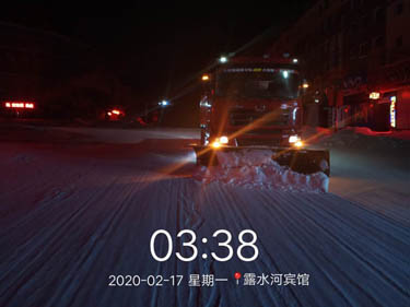 当前,疫情防控正处于关键时期,2月15日凌晨3:00左右,露水河辖区开始强降雪,这也是2020年立春后的第一场大雪。“11时50分抚松县气象台发布暴雪蓝色预警”,“14时59分吉林省气象台发布道路冰雪橙色预警”,每一条天气预警信号都牵动着清雪防滑领导小组的心。