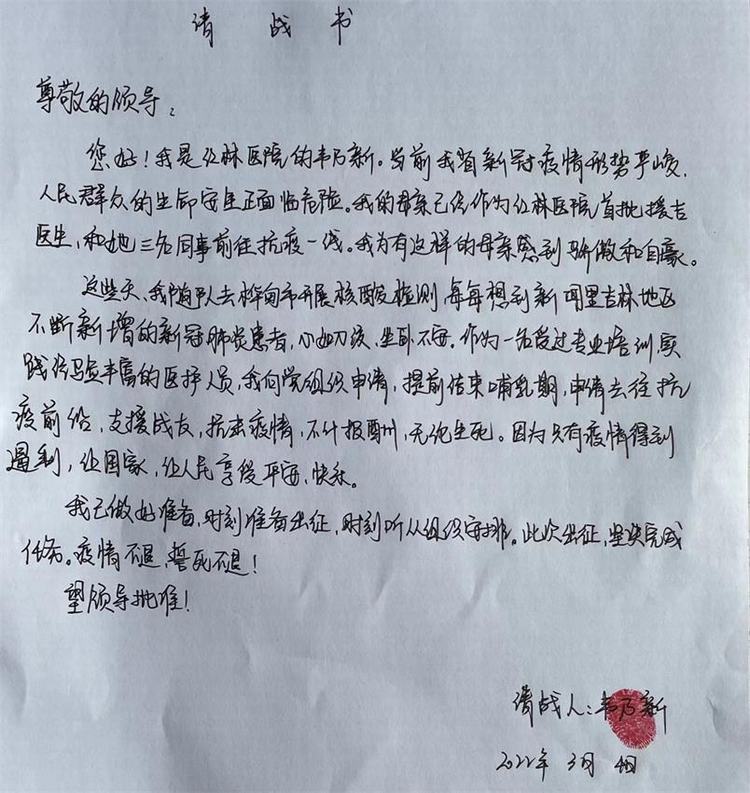 “我的母亲已经作为红林医院首批援吉医生,和她的三名同事前往抗疫一线。我为有这样的母亲感到骄傲和自豪。这些天,我随队在桦甸市开展核酸检测,每每想到新闻里吉林地区不断新增的新冠肺炎患者,心如刀绞、坐卧不安。作为一名受过专业培训,实践经验丰富的医护人员,我向党组织郑重提出申请,提前结束哺乳期,申请前往抗疫前沿,支援战友,抗击疫情,不计报酬,无论生死。我已做好准备,时刻准备出征,听从组织安排。此次出征,坚决完成任务。疫情不退,誓死不退!”援吉医生王相梅的女儿,红林医院护士韦乃新在请战书中写道。