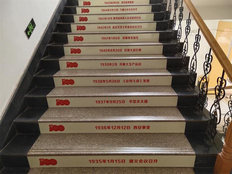 5月28日,进入红石林业局机关的干部员工惊喜地发现,机关楼内发生了新变化:一级级台阶,将中国共产党100年里的历史事件连续展示在眼前,带动人们回望百年党史的辉煌历程。