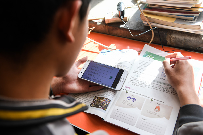 内蒙古准格尔旗龙口镇红树梁村的初一学生刘进才在家中上网课(3月10日摄)。