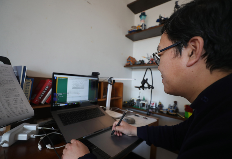 清华大学新闻与传播学院教师梁君健在办公室内进行在线教学(2月17日摄)。