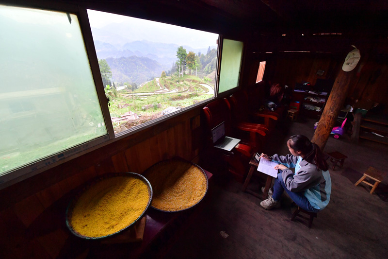 在广西融水苗族自治县杆洞乡党鸠村,就读于广西科技师范学院的梁孟香在家里上网课(4月9日摄)。