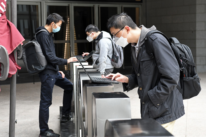 在深圳平安金融中心,企业员工在楼下使用笔记本电脑连接公司内网下载安装远程办公软件,以便实现居家“云办公”(2月10日摄)。