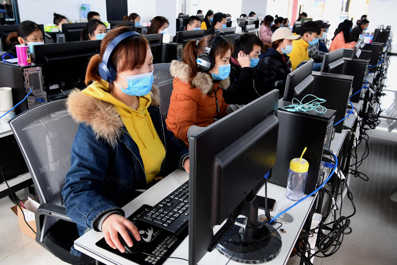 在河南省信阳市光山县科思网络科技有限公司内,被称为“人工智能训练师”的员工戴着口罩和耳机作业(3月28日摄)。