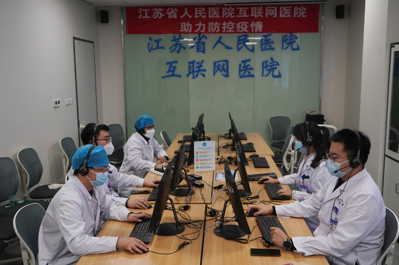 在江苏省人民医院互联网医院办公室,医生和信息处的工作人员在工作(2月7日摄)。