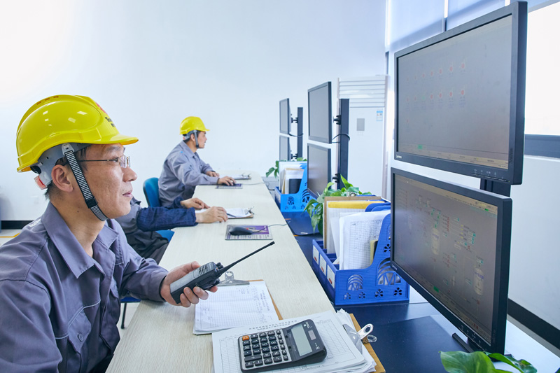 工作人员在位于浙江杭州的传化化学大江东生产基地远程控制和监控硅油产品的生产流程(4月1日摄)。