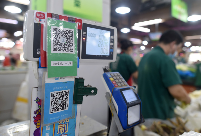 这是5月17日拍摄的浙江省杭州市的5G农贸市场——骆家庄农贸市场一个摊位上的多种支付渠道提示。该农贸市场实现了健康码、聚合支付码、区块链安全溯源码“三码合一”。