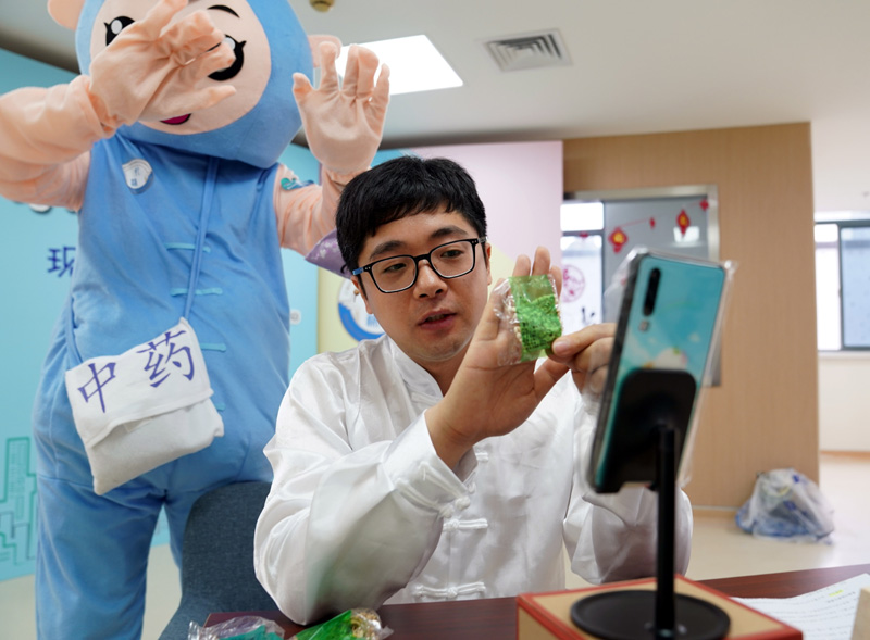 在上海市黄浦区打浦桥街道社区卫生服务中心,家庭医生王杰在直播中介绍夏季中药茶饮知识(5月26日摄)。