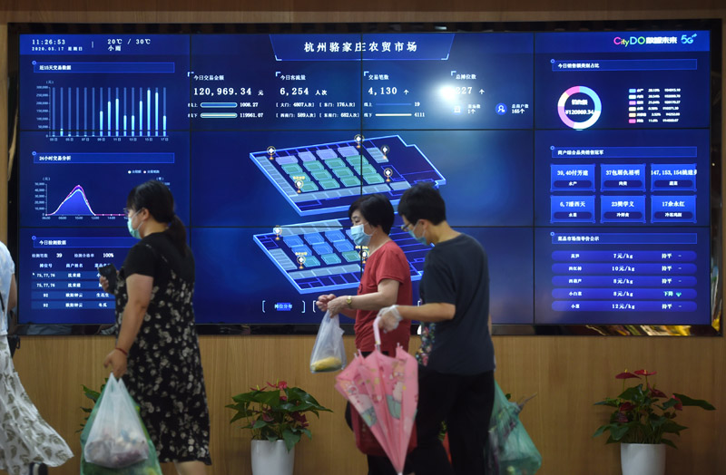 浙江省杭州市的5G农贸市场——骆家庄农贸市场的大屏幕上实时显示交易、客流等相关情况(5月17日摄)。