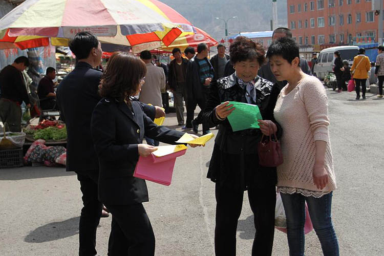 临江林业局森防站工作人员在人员密集的集市上发放林业有害生物防治宣传单。