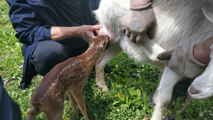 时间就是生命。现场工作人员马上给林场打去救助电话。场领导立即派出车辆前往救助,并第一时间与周边村屯养殖户联系,询问谁家有正处于哺乳期的母羊,为急需进食的狍子幼崽寻找奶源。在得知柳树河村一户村民家中有一只近期刚生产完的母羊后,林场立刻安排工作人员将小狍子送到养殖户家中进行哺乳。看着贪婪地吮吸着羊奶的小狍子,大家都很高兴。
