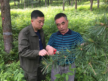 当晚8点,督导组一行深入闹枝红松林木良种基地,与临江林业局森防站工作人员一起开展红松球果害虫成虫期灯光诱捕监测工作,就如何对诱捕收集到的昆虫进行比对,以确定红松球果害虫成虫羽化进度进行了业务指导。次日,督导组在森防站工作人员陪同下,来到闹枝林场落叶松毛虫防治现地,查看了喷施杆状病毒和甲维盐粉剂防治作业现场;在红松球果害虫防治试点样地,查看了红松梢斑螟啮小蜂投放和出蜂情况;在红松球果害虫发生林分,查看了害虫的发育形态和红松雄花散粉情况,对确定红松球果害虫的防治时间进行了预判。